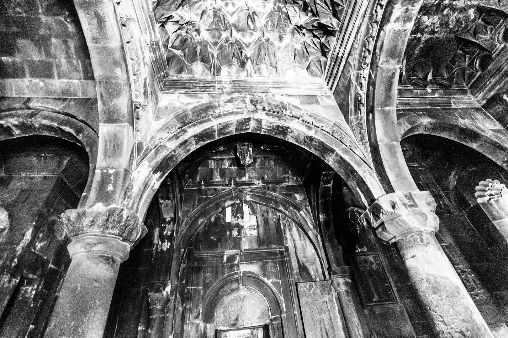 ארמניה היא אחת המדינות הראשונות שעברו בהוראת המלך מעבודת אלילים לנצרות. במסגרת טיול בארמניה ראינו לא מעט כנסיות וותיקות. שלא כהרגלי, סחבתי בתיק הצילום גם עדשה רחבה מאד, 10-20 של סיגמא, והשמשתי בה כדי לקלוט את כל המבנה, ובכמה מקרים, כמו כאן, להבליט את מה שהכי קרוב לעדשה.